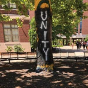 An American Planetree that is located outside the Class of 1950 Lecture Hall. The Diversity Tree celebrates the National Pan-Hellenic Council and Multicultural Greek Council and is often painted with the letters of those member organizations. Its inspiration comes from gathering spaces called plots founded on historically Black college and university campuses, where student organizations assemble and promote their events. Plots differ by size and shape from campus to campus and may be designated by bricks, benches, painted trees, marble stones, or memorial gardens.