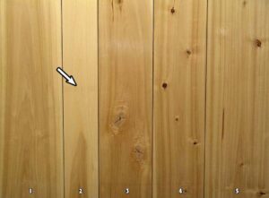Cottonwood is one of our softest and fast growing species. Most commercial grade lumber production is in the southern Mississippi Delta states, but it also commonly grows in lowland areas of the central states. Board 1 shows a subdued grain pattern, grayish heartwood, and white sapwood. The amount of heartwood can vary substantially, and it is not always easy to separate from the sapwood. Board 2 is mostly white sapwood and has a very light stain from a drying sticker. Board 3 is mostly heartwood with two large knots. Boards 4 and 5 show typical knots and light mineral streaks.