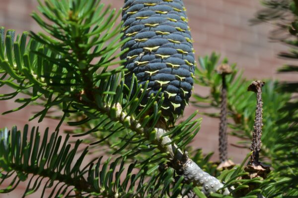 Leaves are 1/2-3/4" long by 1/16-1/12" wide, notched or rounded at apex, dark green above with two whitish bands below divided by a thin green midrib, and thickly set on stem. Rich volet-purple cones, 2-3" long by 1" wide, occuring on plants that have reached 3' tall.