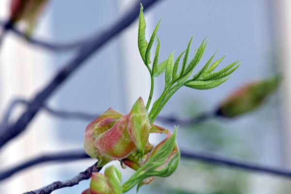 Leaves are alternate, pinnately compound, 8-14" long, with five 4-6" long leaflets. Buds are brown, blunt, and imbricate with loose, pubescent scales. The bark is gray and smooth on younger trees, exfoliating intensely when it matures. The bark of Carya ovata is "shaggier" and more pronounced than that of Carya laciniosa.