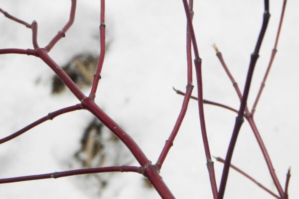 Leaves (2-5" long and 1-1.5" wide) opposite, simple, ovate to oblong-lanceolate, usually rounded at base, dark green above and somewhat glaucous beneath. Dogwood veins sweep toward, but never contact, the leaf margin. Stems are a dull red all year long.