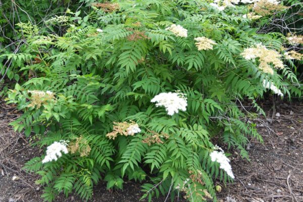 White (Small white flowers in 4-10" pyramidal panicles on new wood, June and July)