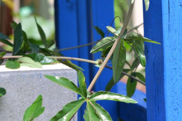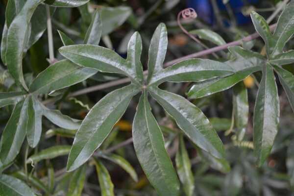 Alternate, shiny leaves 4-7" long and wide, with from 3 to 9 palmate lobes, but typically 5 lobes. The base of each leaf has a flagellate twining tendril 2-5" long, which twines round supporting vegetation to hold the plant up.