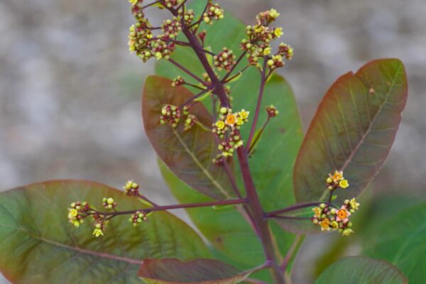Alternate, simple, quite oval leaves (4-6" long by 3" wide) have parallel veination. Purplish coloration around leaf scar. Crushed stems have strong odor. Stems are glabrous with a number of small lenticels.