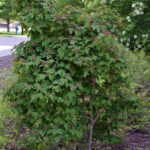 Leaves opposite, 3-lobed, 2-5" long, lobes acuminate (toothed less than Viburnum opulus), sometimes middle lobe elongated, dark green above, soft hairs on veins below, petiole with a shallow grove and numerous, stalked, dome-shaped sticky glands at base of blade (V. opulus has disk-like stalked glands). Stem appears waxy.