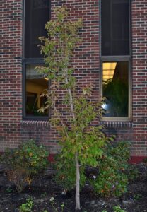 Dark green, elliptical leaves are up to 3" long. Young stems have a zig-zag pattern. Flowers are camellia-like. Muscular, exfolaiting reddish-brown bark. Buds are flattened and divergent. Often a multi-stemmed tree.