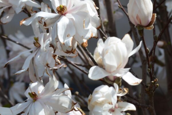 White (Fragrant, white (with pink blush), 5.5" dia. flowers with 28-32 tepals (each 1.5-2.5" long) before leaves, in early April)