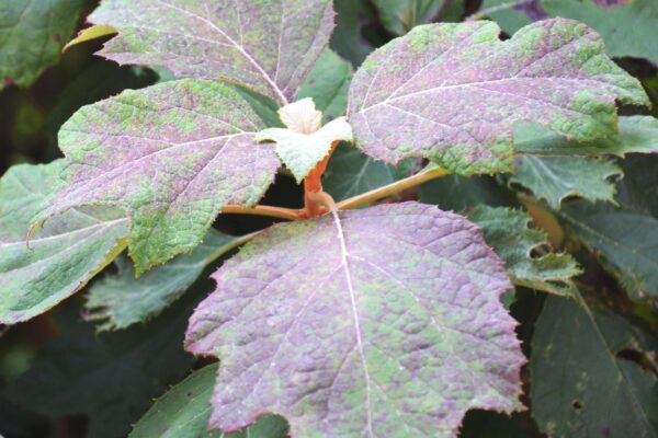 Large (up to 8" long) leaves are opposite, simple, and deeply lobed, resembling large red oak leaves with a white tomentose below. Large leaf scars are triangular. Large (12-15" long) upright flower clusters (panicles) of double, sterile, showy flowers (sepals) emerge in early summer. In the fall, the flowers turn a purplish pink and then brown, persisting into the winter. Cinnamon brown bark on older stems peels and exfoliates.