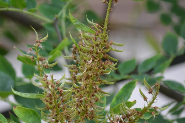 Leaves (8-12" long) are alternate, odd-pinnately compound with 7-11 leaflets (1.5-3.5" long). Glabrous below. New leaves emerge silver. Stems are heavily and irregularly lenticelled. Bark is golden brown and mottled.