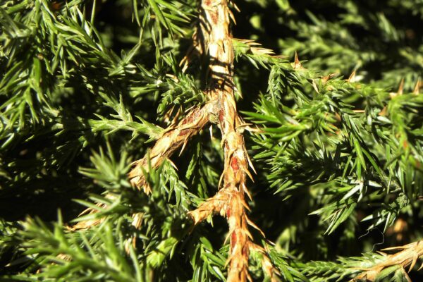 This cultivar is strongly narrow and upright with mostly acicular (needle-like) gray-green leaves. Adult leaves (0.06" long) are scale-like, rhombic, very stiff, and typically 4-ranked in opposite pairs. Adult abaxial leaf surface has a paler margin, and a small glandular depression. Juvenile growth always produces awl-like leaves (0.3-0.5"). Awl leaves are spreading in whorls of 3 or opposite, with green midrib and 2 glaucous bands above, ending in a spiny point.