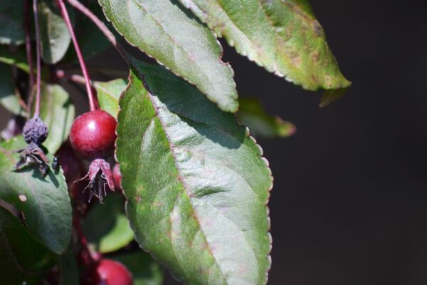 Red (Up to 0.5" dia. purplish-red crabapples (pomes); persistent)