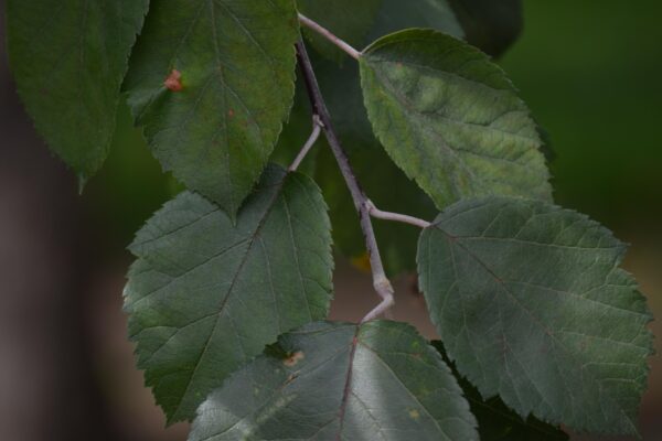 Simple, elliptical leaves in clusters on short spurs. Buds have several imbricate scales and are usually reddish-brown with hairs protruding under scales. Fruits have multiple seeds (as compared to the single seed pit of Prunus species). The bark of mature trees is gray to brown and scaly.