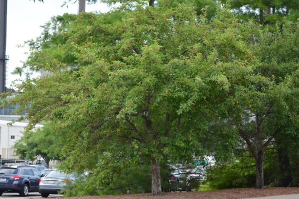 Simple, elliptical leaves (up to 2" long) in clusters on short spurs. Buds have several imbricate scales and are usually reddish-brown with hairs protruding under scales. Fruits have multiple seeds (as compared to the single seed pit of Prunus species). The bark of mature trees is gray to brown and scaly.