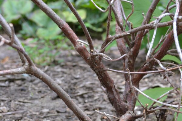 Evergreen leaves are 2-3" long and only 0.-1.5" wide, ferrugineous (i.e. resembling iron rust in appearance or color; brownish red or yellowish red) scaly beneath. Leaves aromatic when bruised. Deep red to purplish red stems.