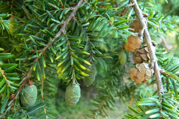 Regularly 2-ranked needles (0.25-0.6" long) with 2 whitish bands beneath. A few needles flip over on top down length of the stem. Cones are 0.5-1" long.