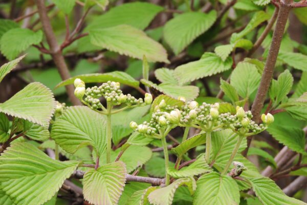 Leaves opposite, simple 2-4" long, half as wide, ovate, coarsely serrate, pubescent underneath, with impressed veins. Buds are naked. Young stems are tomentose. Produces both sterile and fertile flowers (and therefore fruits are produced) in flat-topped cymes (Viburnum plicatum f. plicatum has snowball-shaped cymes of all sterile flowers).