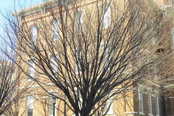 Leaves simple, alternate, ovate to oblong-ovate, 1.3-2" long (and longer), sharply serrate with acuminate teeth, dark green and somewhat rough above. Offset (oblique) at leaf base. Bark heavily lenticelled, reddish brown, and cherry-like when young, exfoliating to reveal orange and brown inner bark at maturity.